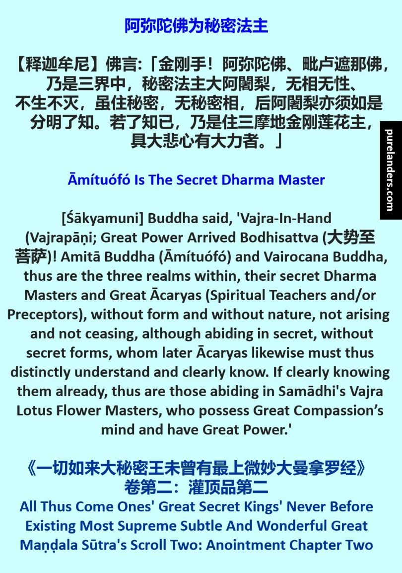 阿弥陀佛为秘密法主Āmítuófó Is [The] Secret Dharma Master 【释迦牟尼】佛言:「金刚手!阿弥陀佛、毗卢遮那佛,乃是三界中,秘密法主大阿闍梨,无相无性、不生不灭,虽住秘密,无秘密相,后阿闍梨亦须如是分明了知。若了知已,乃是住三摩地金刚莲花主, 具大悲心有大力者。」 [Śākyamuni] Buddha said...