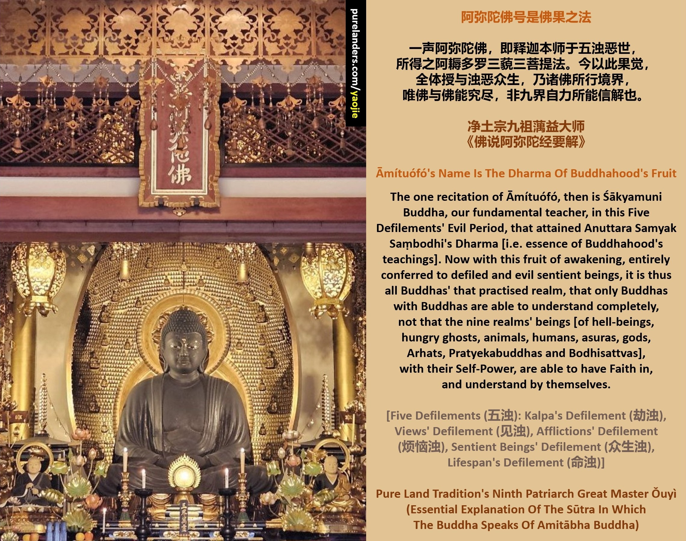 [With] Faith [and] Aspiration upholding [Āmítuófó’s] name, [this] one Practice, not involving doing [of other] actions, completely transforms [the] Five Defilements.
