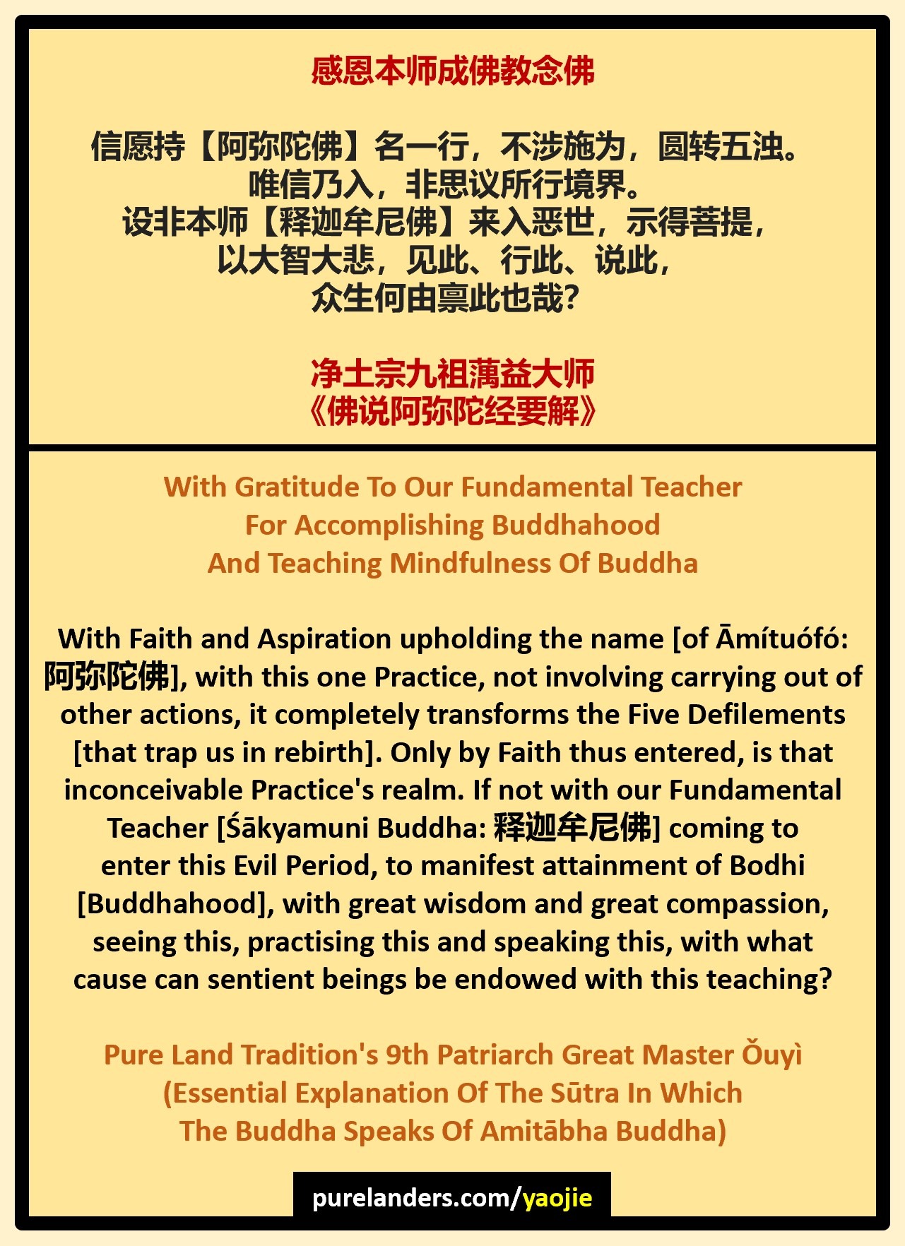 [Explanation]: Therefore, [the] one recitation [of] Amitā Buddha [i.e. Āmítuófó], then [is] Śākya[muni Buddha, our] fundamental teacher, in [this] Five Defilements’ Evil Period, that attained Anuttara Samyak Saṃbodhi’s Dharma.