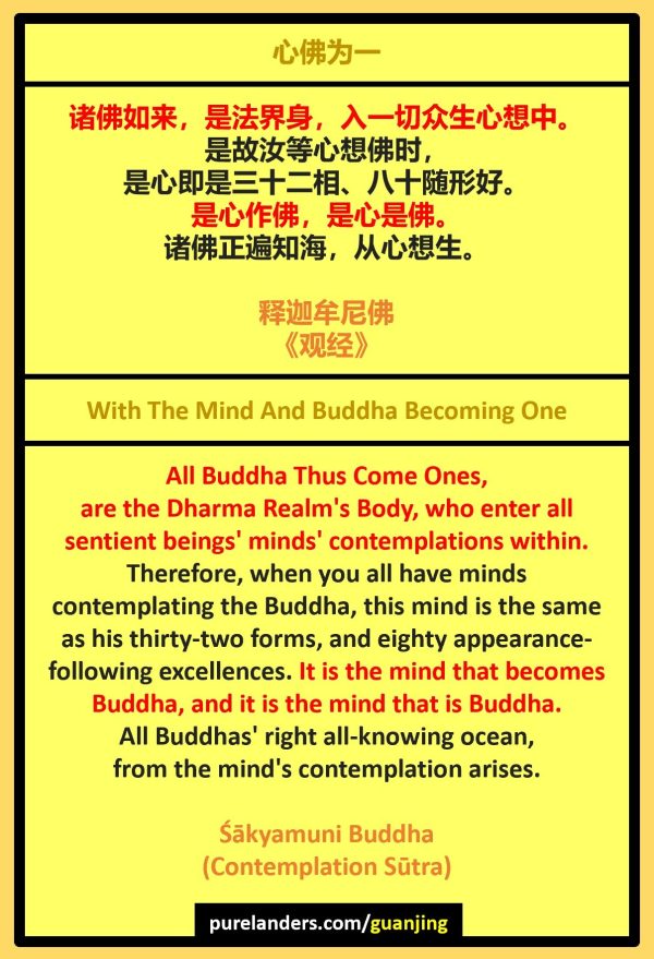 【经】:佛告阿难,及韦提希:「见此事已,次当想佛。所以者何?诸佛如来,是法界身,入一切众生心想中。是故汝等心想佛时,是心即是三十二相、八十随形好。是心作佛,是心是佛。诸佛正遍知海,从心想生。是故应当一心系念,谛观彼佛多陀阿伽度、阿罗诃、三藐三佛陀。