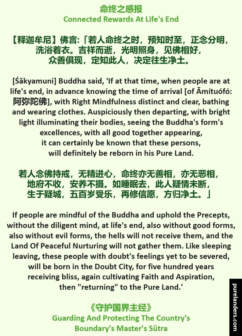 [In the] Sūtra [On] Guarding [And] Protecting [The] Country’s Boundary’s Master, [Śākyamuni] Buddha said, ‘[1] If [at] that time, [when] people [are at] life’s end, [i] in advance knowing [the] time [of] arrival [of Āmítuófó: 阿弥陀佛], [ii] [with] Right Mindfulness distinct [and] clear, [iii] bathing [and] wearing clothes. [iv] Auspiciously then departing, [v] [with] bright light illuminating [their] bodies, [vi] seeing [the] Buddha’s [i.e. Āmítuófó: 阿弥陀佛] form’s excellences, [with] all good together appearing, [it can] certainly [be] known [that] these persons, [will] definitely [be] reborn [in his] Pure Land.