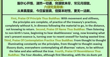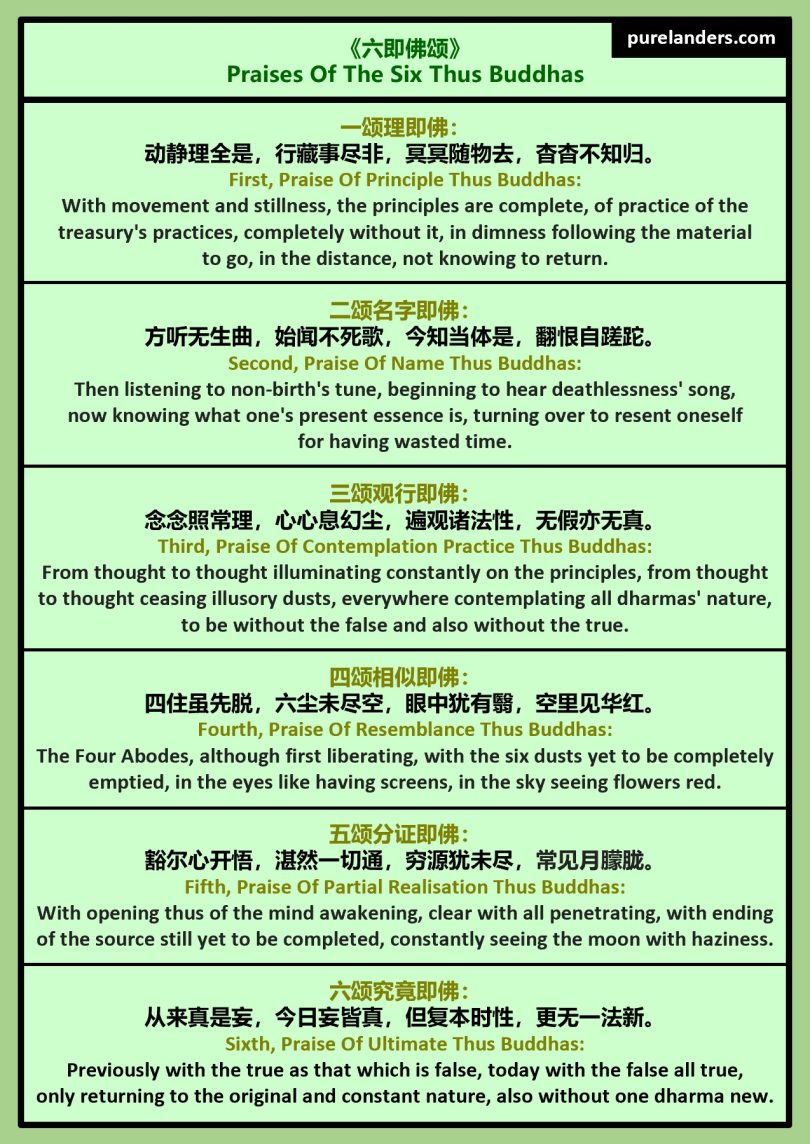 [Note 9: As taught by the Pure Land Tradition’s 13th Patriarch Great Master Yìnguāng (净土宗十三祖印光大师) in his ‘Letter For Master Wùkāi’《与悟开师书》at https://purelanders.com/2022/03/31/2-with-one-character-one-line-one-verse-and-one-book-speaking-of-the-pure-land-dharma-door, ‘”In ‘Praises Of The Six Thus Buddhas”, studying it, this can be known. That one line [that sums up their essence], is “Faith, Aspiration and Practice” [for mindfulness of Buddha, to be born in Pure Land, for progress towards Buddhahood].’ (于《六即佛颂》研之可知也。一句者,「信愿行」也。)]