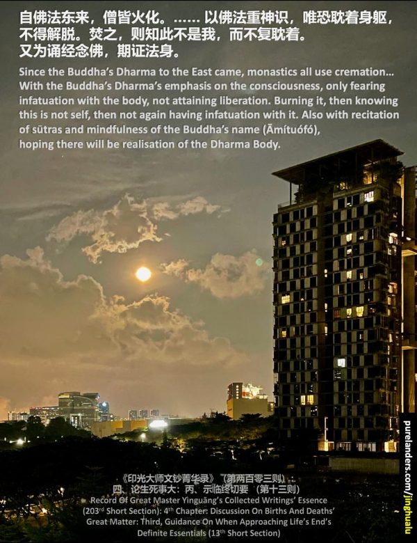 [Note 2: When dying and deceased, there should be renunciation of the then useless body, only with attention on how to resettle the consciousness, ideally in Āmítuófó’s (阿弥陀佛) Pure Land (净土). This should be expressed with the Main Practice (正行) of utmost sincere mindfulness of Āmítuófó’s name with Aspiration (愿) to be reborn in his Pure Land.]