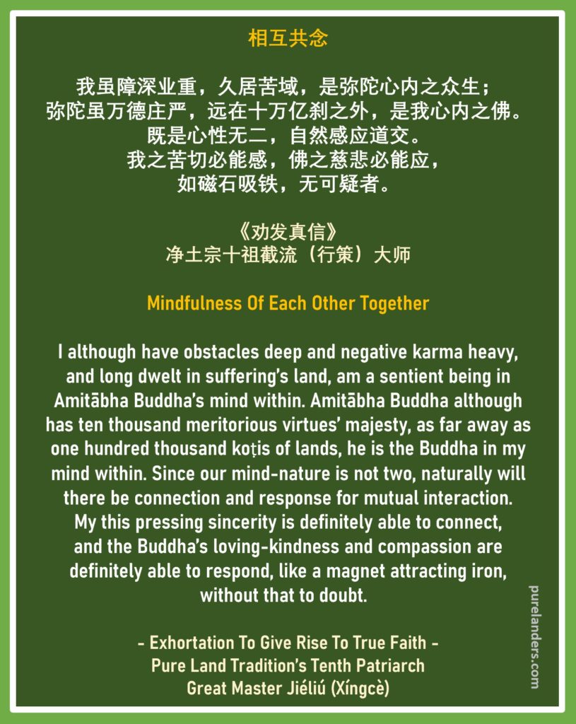 In summary, as the Pure Land Tradition’s Tenth Patriarch Great Master Jiéliú (Xíngcè) (净土宗十祖截流[行策]大师) taught in his ‘Exhortation To Give Rise To True Faith’ 《劝发真信》, ‘I, although have obstacles deep and evil karmas heavy, and long dwelt in suffering’s land, am a sentient being in Āmítuófó’s mind within. Āmítuófó, although has ten thousand meritorious virtues’ majesty, as far away as one hundred thousand koṭis of lands, he is the Buddha in my mind within. (我虽障深业重,久居苦域,是弥陀心内之众生;弥陀虽万德庄严,远在十万亿刹之外,是我心内之佛。)
