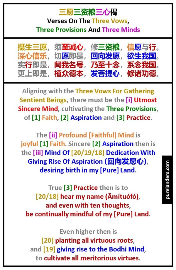 The [Mind (ii)] Profound [Faithful] Mind is joyful [Provision (1)] Faith. Sincere [Provision (2)] Aspiration then is the [Mind (iii)] Mind Of [Vow 20/19/18] Dedication With Giving Rise Of Aspiration (回向发愿心), desiring birth in my [Pure] Land.