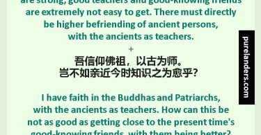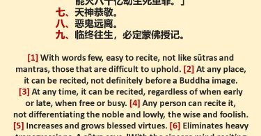 Only [the] Pure Land Dharma Door, relies [on the] Buddha’s vow’s power of gathering [and] receiving. [With] one’s sincerity of Faith [and] Aspiration mindful [of the] Buddha[‘s name] [Āmítuófó (阿弥陀佛)], regardless [of having] realised [and] awakened or not, and even those [with] afflictions [and] confusions’ very small amount yet [to be] severed, all can rely on [the] Buddha’s compassionate power, [to] immediately in [this] present life, [be] reborn [in his] Western [Pure Land Of Ultimate Bliss] [西方极乐世界].