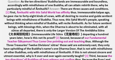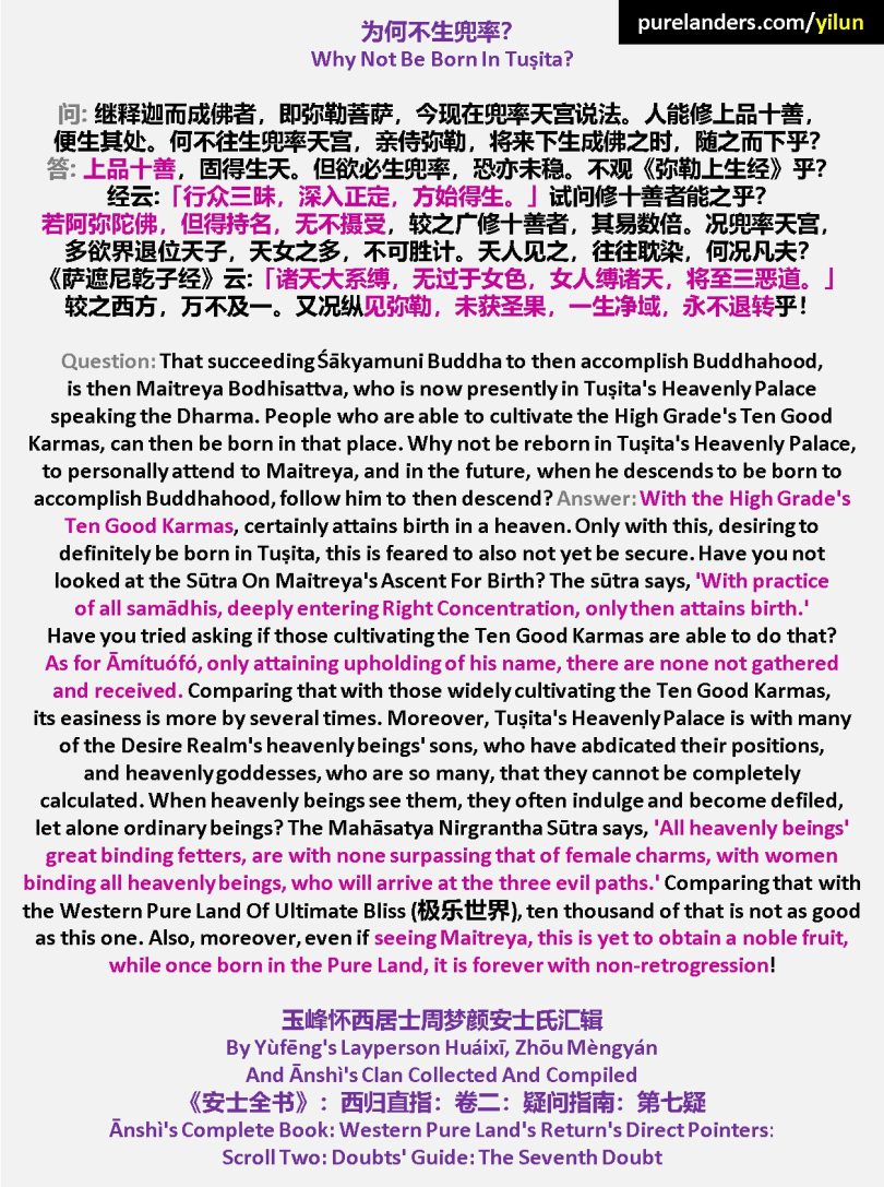 Question: That succeeding Śākya[muni Buddha to] then accomplish Buddhahood, [is] then Maitreya Bodhisattva, [who is] now presently in Tuṣita’s Heavenly Palace speaking [the] Dharma. People [who are] able [to] cultivate [the] High Grade’s Ten Good [Karmas (十善业), can] then [be] born [in] that place. Why not [be] reborn [in] Tuṣita’s Heavenly Palace, [to] personally attend [to] Maitreya, [and in the] future, when he descends [to be] born [to] accomplish Buddhahood, follow him [to] then descend?