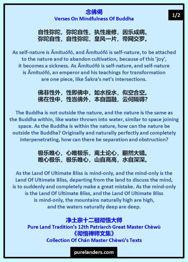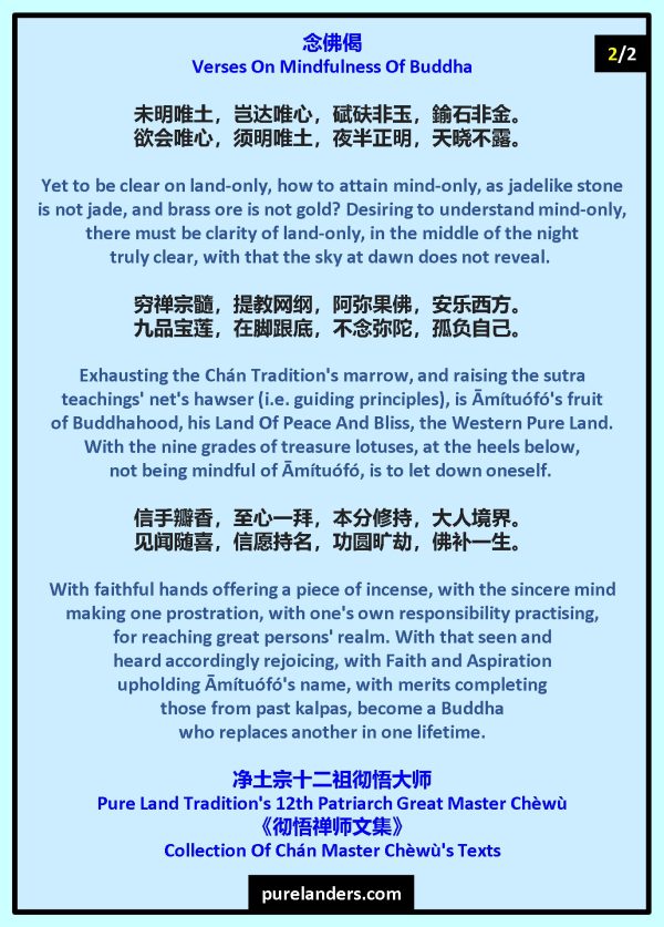 Exhausting [the] Chán Tradition’s marrow, [and] raising [the sūtra] teachings’ net’s hawser [i.e. guiding principles], [is] Āmí[tuófó’s] fruit [of] Buddhahood, [his Land Of] Peace [And] Bliss, [the] Western [Pure Land.[With the] nine grades [of] treasure lotuses, at [the] heels below, not [being] mindful [of Ā]mítuó[fó, is to] let down oneself.