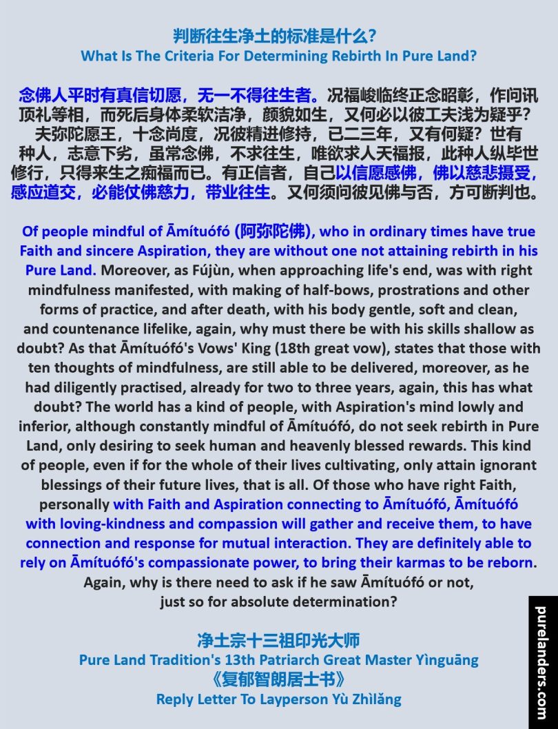 [Note 1: This is not to say that those who assume and/or claim they already have Faith and Aspiration do not need Practice of mindfulness of Āmítuófó in everyday life. In fact, the Great Master also taught that those who have Faith and Aspiration will express them by practising mindfulness of Āmítuófó in everyday life: https://purelanders.com/2019/08/01/is-your-faith-and-aspiration-resolute-enough. Thus, with the Three Provisions (三资粮) of Faith, Aspiration and Practice (信愿行) complete (https://purelanders.com/2018/02/08/the-three-provisions), birth in Pure Land is definite.]