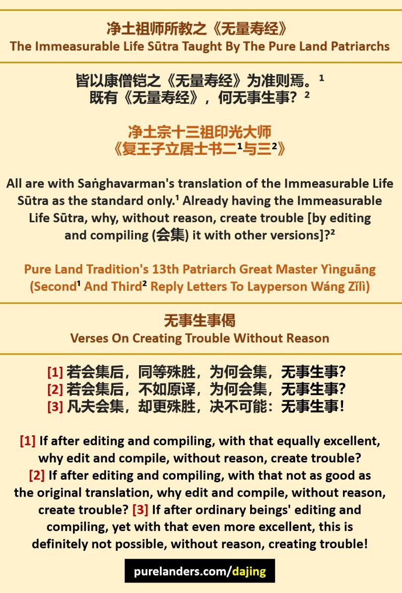 All [are] with Saṅghavarman’s [translation] of [the] Immeasurable Life Sūtra as [the] standard only.¹ Already having [the] Immeasurable Life Sūtra, why, without reason, create trouble [by editing and compiling (会集) it with other versions]?²