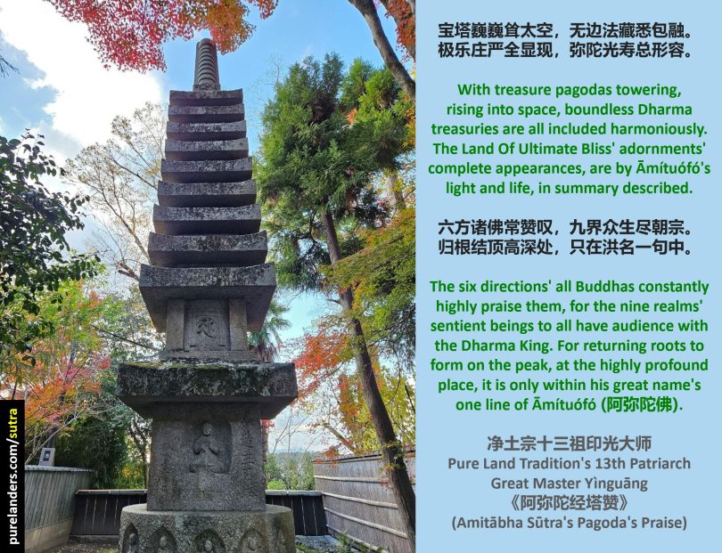 [With] treasure pagodas towering, rising [into] space, boundless Dharma treasuries [are] all included harmoniously. [The Land Of] Ultimate Bliss’ adornments’ complete appearances, [are by Ā]mítuó[fó’s] light [and] life, in summary described.