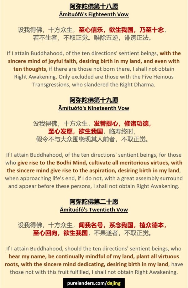 [4] Those first cultivating pure karmas should first pay attention to the eighteenth vow, to ensure attainment of birth in the Pure Land.
