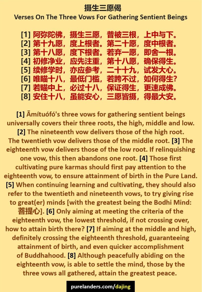 [8] Although peacefully abiding on the eighteenth vow, is able to settle the mind, those by the three vows all gathered, attain the greatest peace.