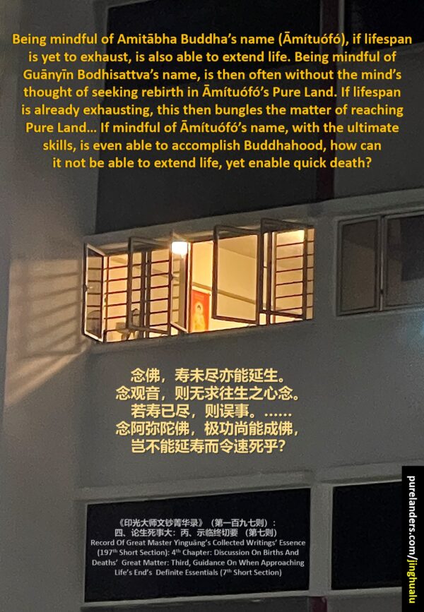 [Being] mindful [of] Buddha, [if] lifespan [is] yet [to] exhaust, [is] also able [to] extend life. [Being] mindful [of] Guānyīn [Bodhisattva’s name, is] then [often] without the mind’s thought of seeking rebirth [in Āmítuófó’s Pure Land].
