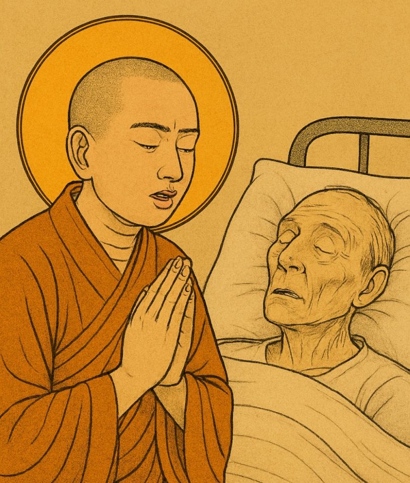 [When] people have great sicknesses, [they] should immediately have rebirth’s thought, [with] wholehearted mindfulness [of Amitā(bha)] Buddha[‘s name: Āmítuófó (阿弥陀佛)]. If lifespan [is] yet [to] exhaust, due [to] mindfulness [of Āmítuó]fó thus, [there] can immediately [be] quick healing. (‘Āmítuó’ [i.e. Amitā] thus [is] ‘Immeasurable’ Life, thus is [able to] eliminate disasters [and] extend life.)