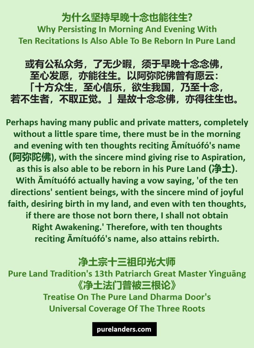 Perhaps having many public [and] private matters, completely without [a] little spare time, [there] must [be] in [the] morning [and] evening [with] ten thoughts reciting [Āmítuó]fó’s [name (阿弥陀佛), with the] sincere mind giving rise [to] Aspiration, [as this is] also able [to be] reborn [in his Pure Land (净土)].