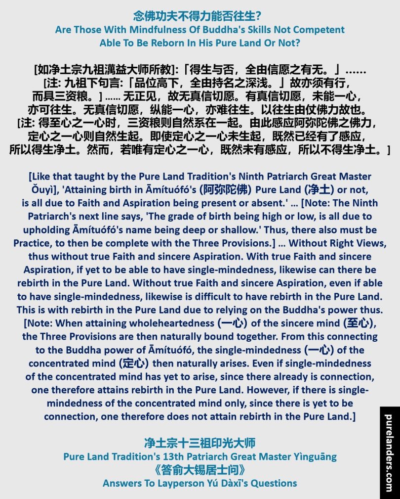 Answer: [Like that taught (by the) Pure Land Tradition’s Ninth Patriarch Great Master Ǒuyì], ‘Attaining birth [in Āmítuófó’s (阿弥陀佛) Pure Land (净土)] or not, [is] all due [to] Faith [and] Aspiration [being] present [or] absent.’ How can [there be] nonsensical talk [and] idle chat [about this, that is] not with that [which] ancient persons speak for guidance?