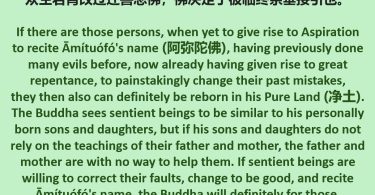 [Note 1: (The) Ninth Patriarch’s next line says, ‘(The) grade (of birth being) high (or) low, (is) all due to (the Practice of) upholding (Āmítuófó’s) name (being) deep (or) shallow.’ Thus, (there) also must be Practice, (to) then (be) complete (with the) Three Provisions, yet (with the) amount of energy and time due to (the) practitioner’s conditions.]