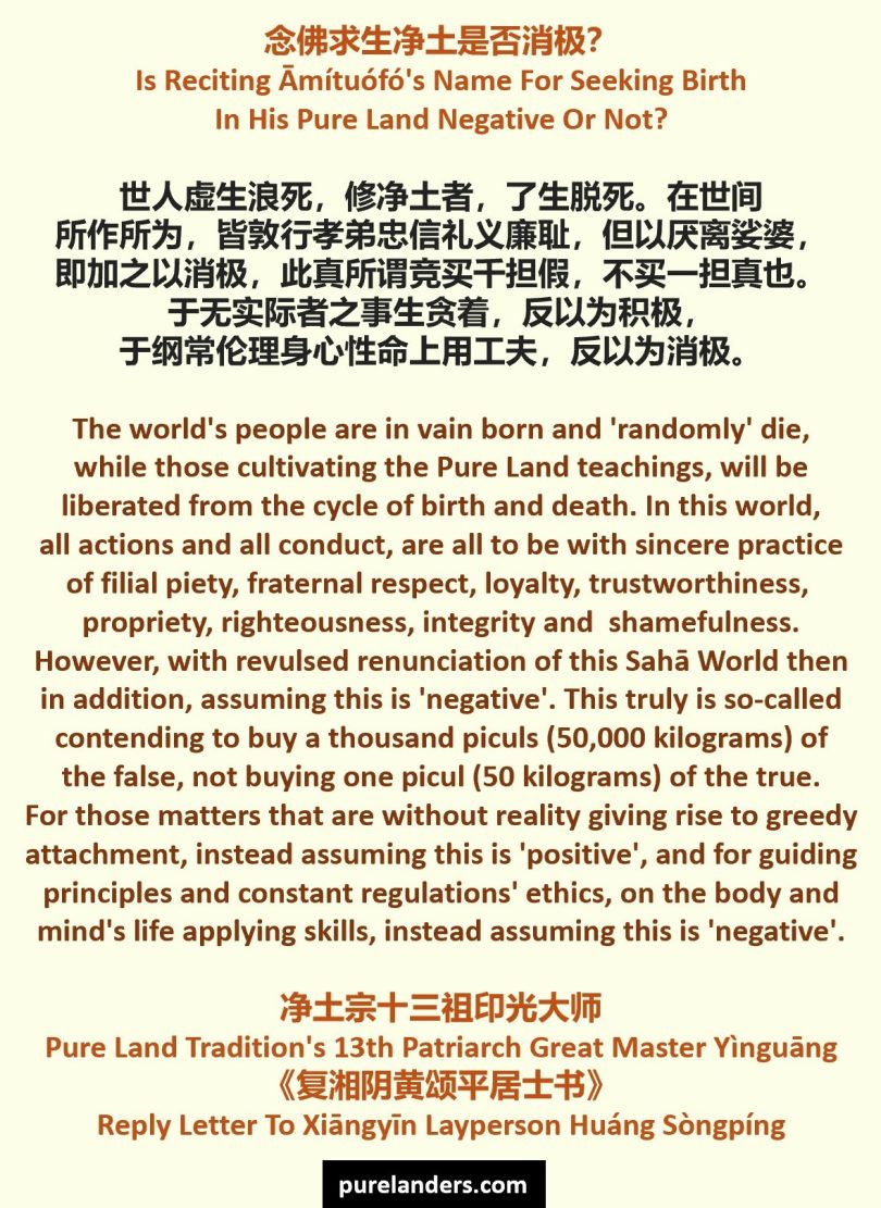 In [this] world, all actions [and] all conduct, [are] all [to be with] sincere practice [of the Eight Virtues (八德) of] (i) filial piety, (ii) fraternal respect, (iii) loyalty, (iv) trustworthiness, (v) propriety, (vi) righteousness, (vii) integrity [and] (viii) shamefulness. However, with revulsed renunciation [of this] Sahā World then in addition, assuming [this is] ‘negative’. This truly [is] so-called contending [to] buy [a] thousand piculs [i.e. 50,000 kilograms] [of the] false, not buying one picul [i.e. 50 kilograms] [of the] true.