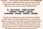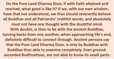 [Note 1: This is very important as to have definite Faith is to adequately accumulate the very first of the Three Provisions (三资粮), of Faith (信), Aspiration (愿) and Practice (行) for reaching Pure Land. When there are doubts, there should be more sincere learning and practice, with swift clarification through the Buddhas words and the Patriarchs’ further explanations. When teachers’ advice is sought, only that with proper references to the Buddhas and Patriarchs should be heeded.]