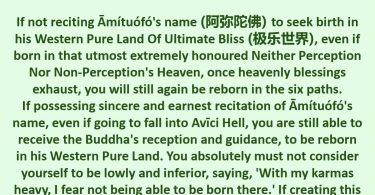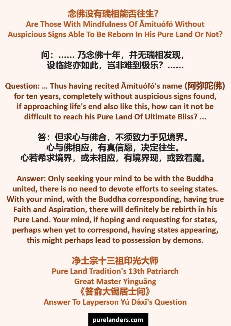 Question: [There] are those cultivating attaining good states, or dreaming of [the] Western [Pure Land Of Ultimate Bliss (极乐世界)], or facing [to] see [Ā]mítuó[fó], or smelling extraordinary fragrance, or seeing [a] lotus flower. Xiāng Province’s [i.e. Húnán (湖南)] layperson Wáng Jìguǒ frequently had [that] seen. Thus [having] recited [Āmítuó]fó[‘s name (阿弥陀佛) for] ten years, completely without auspicious signs found, if approaching [life’s] end also like this, how can [it] not [be] difficult [to] reach [his Land Of] Ultimate Bliss? Actually, is it possible or not, [to] allow this [to be] natural, [by] not giving rise [to] hope?